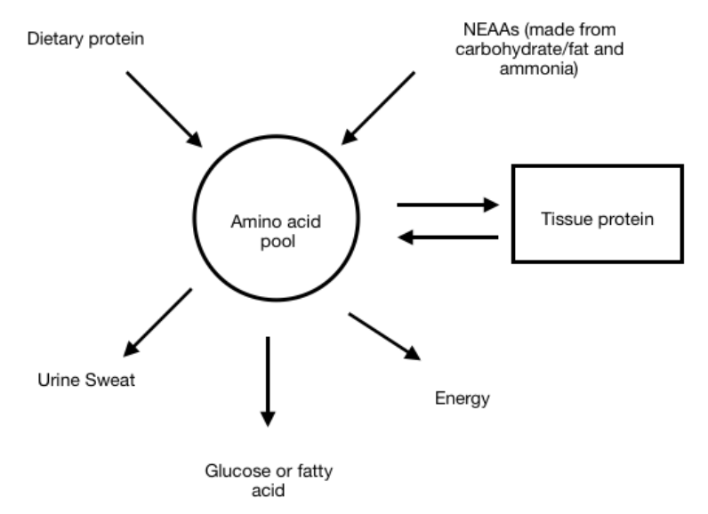 12 amino acids can be made by the body (non-essential amino acids- NEAAs), the other 8 amino acids the body can’t synthesise and therefore they have to be provided with a diet, these are called essential amino acids (EAAs). Protein that you consume with the diet is broken down to amino acids so they can be reused for building muscles and other various processes.