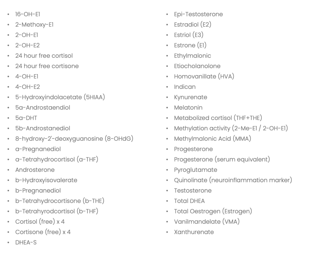 - Levels of glutathione (detox), melatonin (sleep), DHEA (adrenals) and much more!