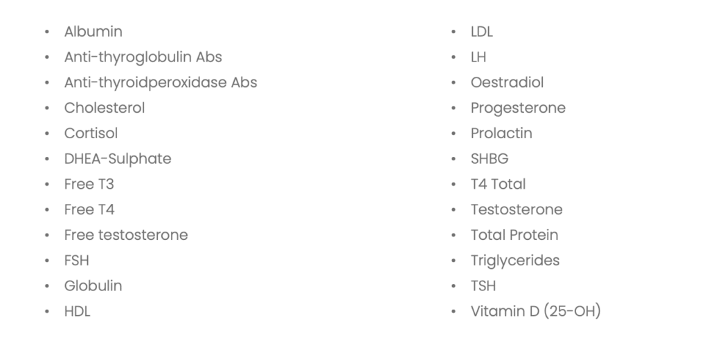 The Female Hormone Profile includes 23 biomarkers that provide a goods assessment of hormones involved in female health. In addition to the classical sex hormones like estrogen, progesterone and testosterone, this test also examines the crucial feedback loops between the pituitary gland and the thyroid, adrenal glands, and ovaries.